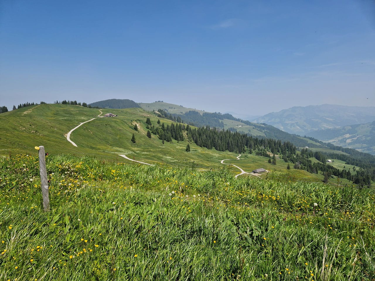 Mit Blick auf die Kaiseregg geht es anschliessend auf einer geschotterten Piste steil bergab – ein Abschnitt, der volle Konzentration erfordert. Nach der Abfahrt lege ich eine Pause bei der Alp-Schaukäserei ein, die auch kleine Imbisse anbietet. Eine kurze Steigung bringt mich danach noch einmal in die Höhe, bevor es auf gut fahrbaren Wegen nur noch bergab geht. Eine schöne Runde, mit einigen Passagen, die mich durchaus gefordert haben.